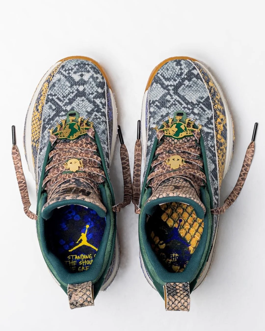 The Melody Ehsani x Air Jordan 36 PE comes covered in a multitude of colored snakeskin patterns. Indigo, teal, emerald, and yellow make up the sneaker’s color palette, complimented by gold accents. The zig-zag textured outsoles come with a hamsa design in the center. A symbol of faith and protection, the hamsa, or ‘Hand of God’, is primarily used by members of the Jewish faith in art and amulets. The inside sole reads “standing on the shoulders of greats,” honoring the ancestors that came before us and paved the way for our successes. The Melody Ehsani ‘ME.’ brand logo is printed in bold black lettering on the tongue. Gold lace dubraes of a hamsa and Earth complete the look.